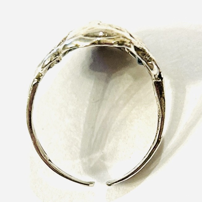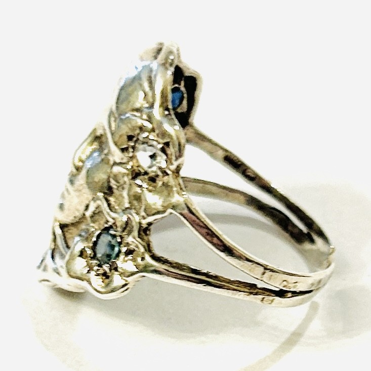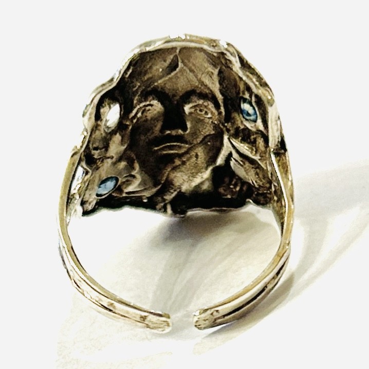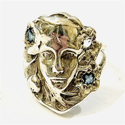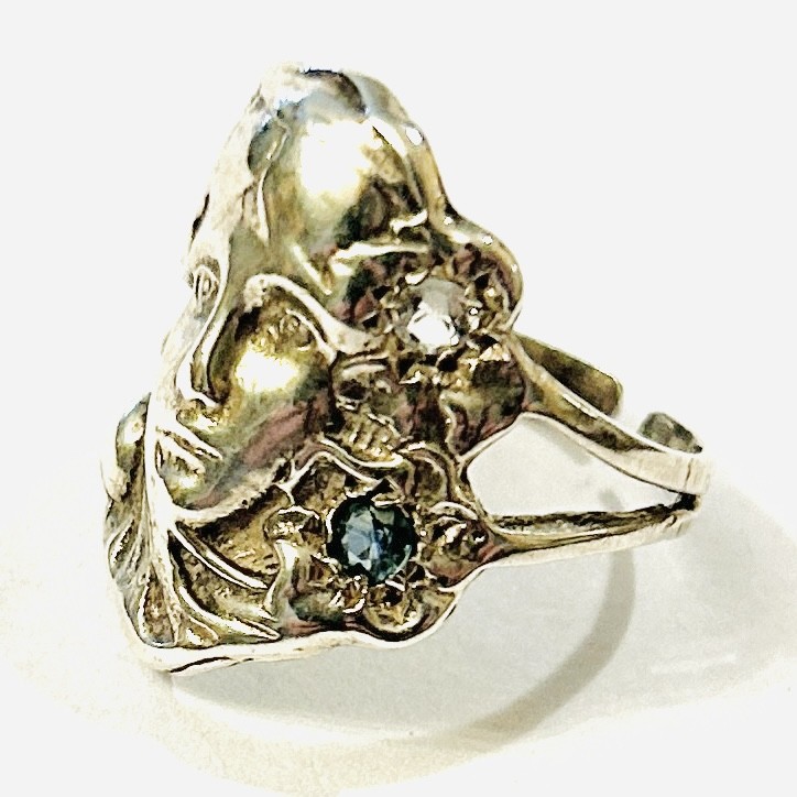 Půvabný, dekorativní prsten v pseudosecesním stylu s plasticky tvarovanou hlavicí s tváří dívky, květy propletené ve vlasech jsou osazeny 2 přírodními modrými safíry a přírodním leukosafírem kulatého brusu. Západoevropská práce z 2. poloviny 20. století. Zhotoveno z nezlaceného stříbra o ryzosti 800/1000; nově opatřeno puncem S-69 (zajíc 5) a ryzostní číslo zevnitř šíny. Hmotnost 4,65 g, nastavitelná velikost okolo 55, délka hlavice 23 mm. V zachovalém stavu, odborně vyčištěno a vyleštěno zlatníkem.