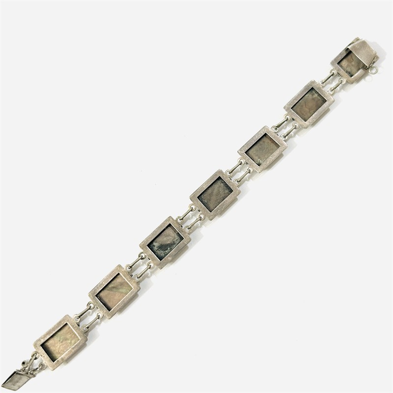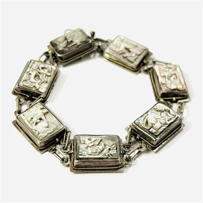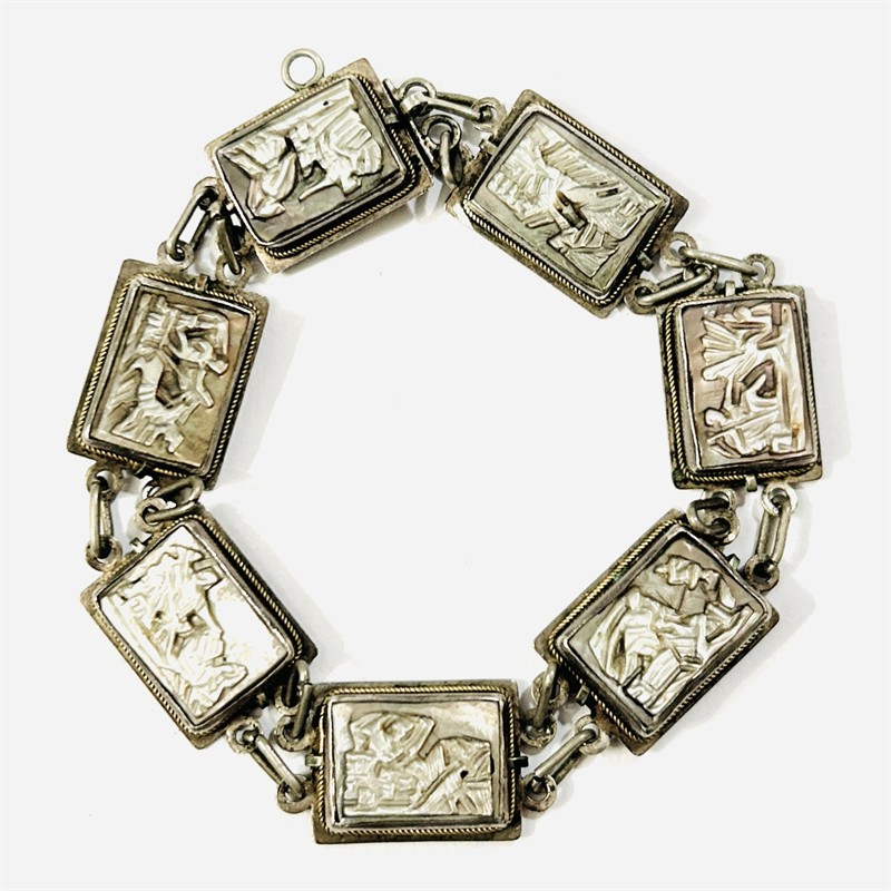 Nevšední článkový náramek osazený 7 obdélnými kamejemi z přírodní bílo-šedé perleti s mytologickými motivy, rámováno zlatavým pletencem. Ruční, patrně středoamerická zlatnická práce z 2. třetiny 20. století. Zhotoveno z nezlaceného stříbra o ryzosti 925/1000, zapínání, spojovací očka a pletence z obecného kovu; vyhotoveno osvědčení puncovního úřadu, značení na jazýčku. Hmotnost 16,25 g, délka 18,5 cm, šířka 12,5 mm. Jazýčkové zapínání v pořádku, ponecháno s přirozenou patinou, celkově ve velmi zachovalém stavu.