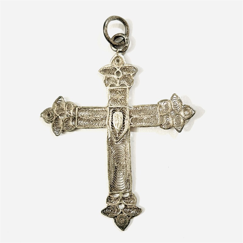 Výrazný, větší přívěšek ve tvaru latinského kříže se zdobnými závěry ramen, vyplněno filigránovými volutami. Patrně balkánská ruční práce z 20. až 30. let 20. století, dovezeno na naše území ve stejném období. Zhotoveno z nezlaceného stříbra o ryzosti 925/1000; československý dovozový punc S-43 (lilie s Č) a ryzostní číslo na oušku. Hmotnost 4,31 g, celková délka 65 mm, šířka 46,5 mm. Ponecháno s přirozenou patinou, lze vyčistit, jinak ve velmi zachovalém stavu.