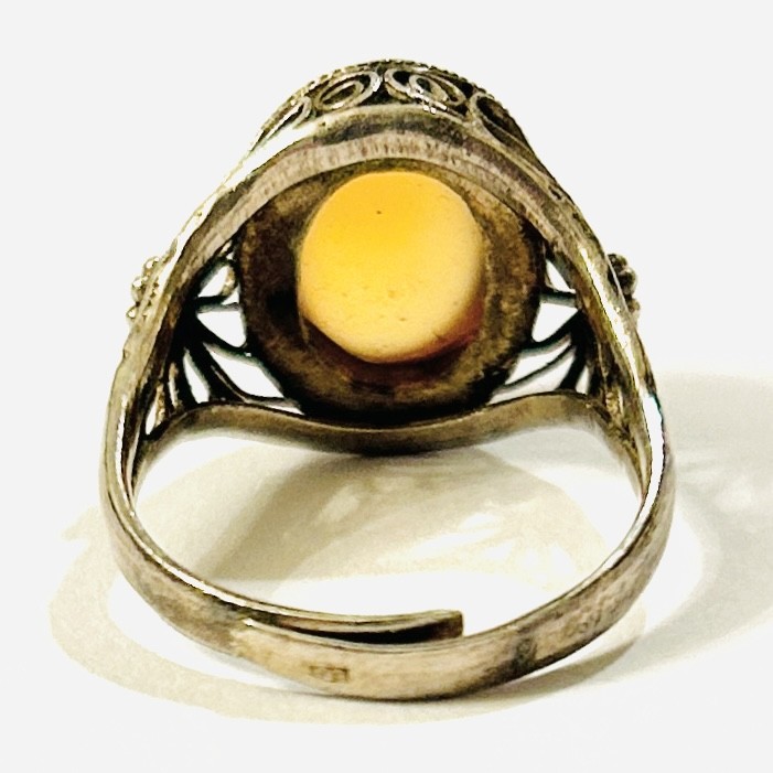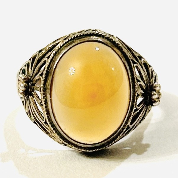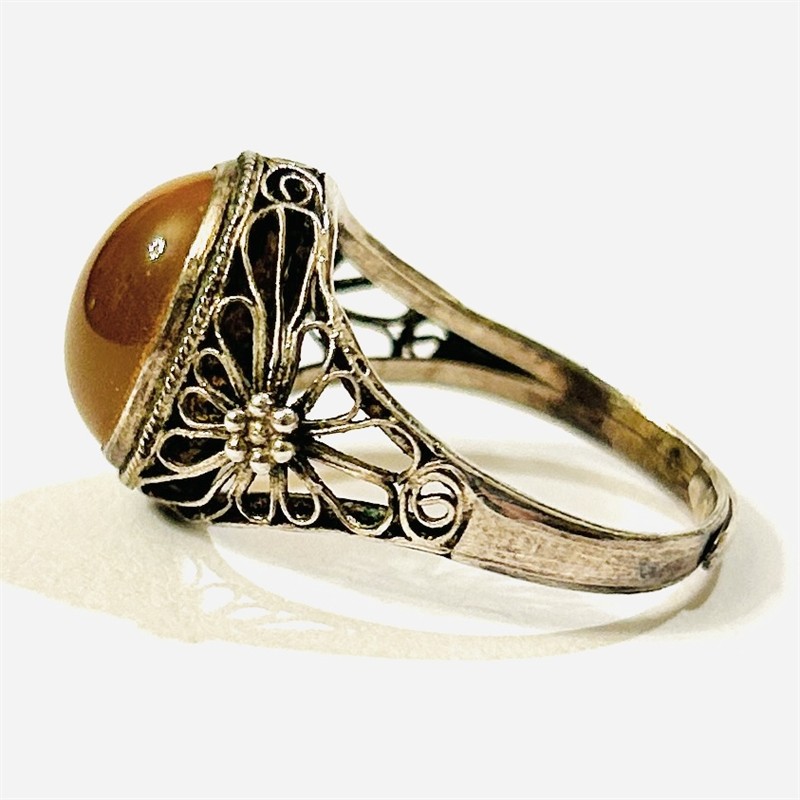 Půvabný, starožitný prsten osazený oválnou muglí žlutě zbarveného přírodního karneolu fasováno v plně přiléhající obrubě, rámováno pletencem, bok a ramena šíny zdobena filigránoými volutami a granulovanými kuličkami. Patrně východoasijská zlatnická práce z 20. až 30. let 20. století. Zhotoveno z nezlaceného stříbra o ryzosti 925/1000; československý dovozový punc S-43 (lilie s Č) a ryzostní číslo zvnějšku šíny. Hmotnost 3,45 g, nastavitelná velikost okolo 55, délka hlavice 14,5 mm. Ponecháno s přirozenou patinou, lze vyčistit, jinak v zachovalém stavu.