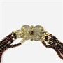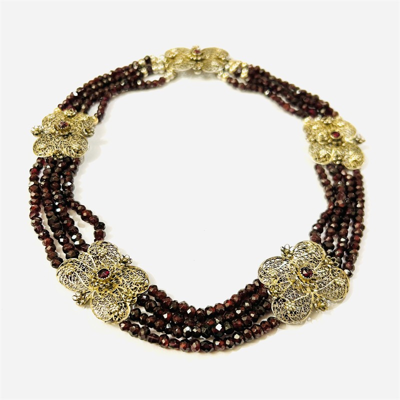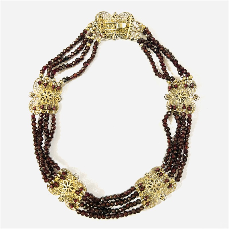 Honosný náhrdelník folklórního charakteru skládající se ze 4 řad kombinace vrtaných nepravidelně broušených různých druhů přírodních granátů včetně českých, dekorativní články vyplněny filigránovými volutami a motivy květů, ve středu osazeno českými granáty kulatého routového brusu. Kvalitní, patrně německá práce z 2. poloviny 19. století. Zhotoveno z velmi jemně zlaceného stříbra, kuličky a očka u zapínání o ryzosti 925/1000, články o ryzosti 835/1000; vyhotoveno osvědčení puncovního úřadu, neznačeno. Hmotnost 59,40 g, délka 40,5 cm, šířka článku 24,5 mm. Důmyslně schované háčkové zapínání v pořádku. Nově převlečeno na bordó niť, kuličky nepůvodní, celkově v zachovalém stavu, odborně vyčištěno zlatníkem.