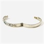 Elegantní otevírací náramek, jehož frontální část je osazena kulatě broušenými tyrkysy, zdobeno jemným rytím s motivem listů, dolní část ponechána hladká. Kvalitní zlatnická práce z území rakousko-uherské monarchie ze 70. až 80. let 19. století. Vyrobeno technikou dutého kovu. Zhotoveno z nezlaceného stříbra o ryzosti 750/1000; rakousko-uherský punc S-34 (lev 4) na zapínacím jazýčku, mistrovská značka "IN" či "NI" též a zevnitř náramku. Hmotnost 10,47 g, vnější délka 58 mm, vnitřní délka 52 mm (velikostí tedy na subtilnější zápěstí), šířka 8 mm. Jazýčkové zapínání v pořádku, 2 tyrkysy nahrazeny patrně tyrkysovým sklem, lehké stopy nošení, jinak v dobrém stavu, odborně vyčištěno a vyleštěno zlatníkem.