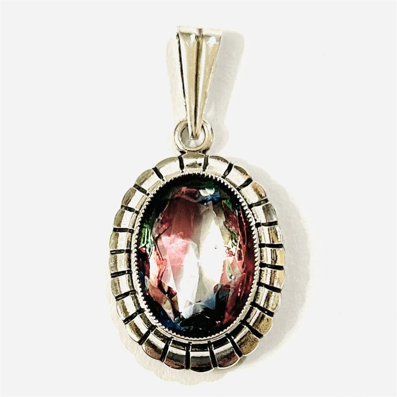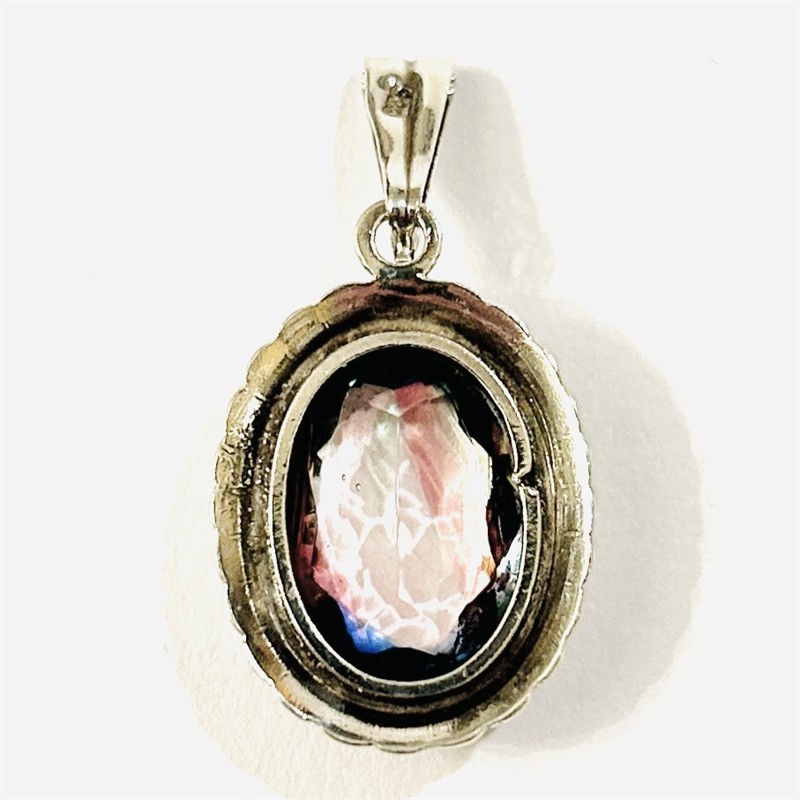 Půvabný přívěšek osazený nevšedním různobarevným skleněným kamenem oválného brusu, který má napodobovat mystický topaz, rytmický jemně vlnitý rámeček. Patrně německá zlatnická práce ze 3. čtvrtiny 20. století. Zhotoveno z nezlaceného stříbra o ryzosti 835/1000; ryzostní číslo na očku. Hmotnost 2,83 g, celková délka 30 mm, šířka 15,5 mm. V zachovalém stavu, odborně vyčištěno a vyleštěno zlatníkem.
