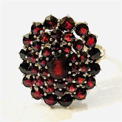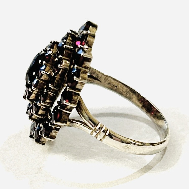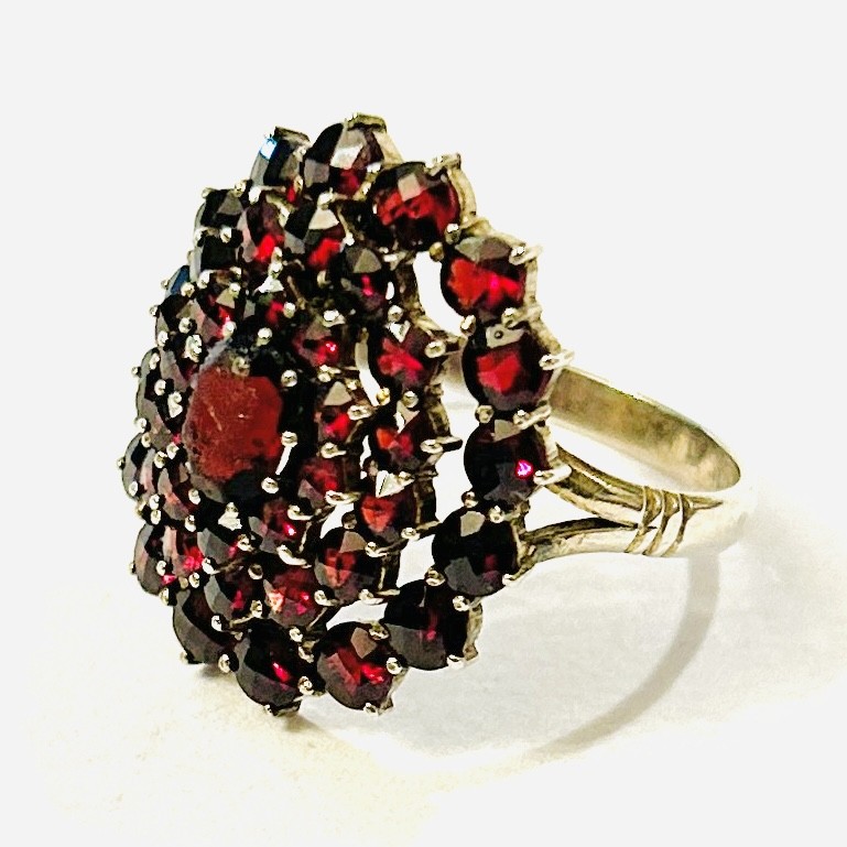 Efektní, prsten koktejlového typu s oválnou stupňovitou hlavicí osázenou českými granáty kulatého šachovnicového brusu, centrální kámen granátovým sklem oválného brusu, fasováno zrnkovou technikou. Precizní granátnická práce klenotníka Františka Šimůnka z Lomnice nad Popelkou z 2. poloviny 40. let 20. století. Zhotoveno z nezlaceného stříbra o ryzosti 900/1000; československý punc S-62 (kozlík 3) zvnějšku šíny, ryzostní čísla a mistrovská značka "FŠ" zevnitř šíny. Hmotnost 4,63 g, velikost 62, délka hlavice 22 mm, šířka 19 mm. Centrální kámen podřený, jinak v zachovalém stavu, odborně vyčištěno a vyleštěno zlatníkem.