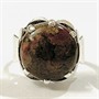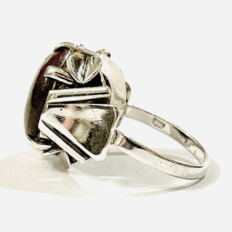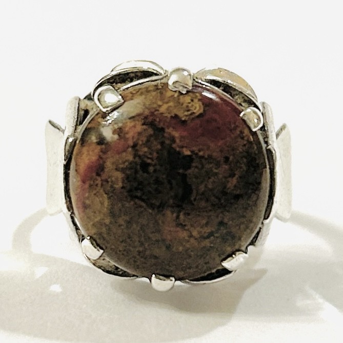 Výrazný prsten koktejlového typu osazený plochou kulatou muglí přírodního českého hnědo-červeného jaspisu, pečlivě fasováno krapnami ve vyšší plasticky tvarované hlavici. Kvalitní práce klenotnického podniku Kovozávody Turnov z 60. až počátku 70. let 20. století. Zhotoveno z nezlaceného stříbra o ryzosti 900/1000; punc S-67 (zajíc 3), ryzostní číslo a značka výrobce "KZT" zevnitř šíny. Hmotnost 4,59 g, velikost 54, délka hlavice 16 mm. Šína lehce vychýlena, celkově v zachovalém stavu, odborně vyčištěno a vyleštěno zlatníkem.