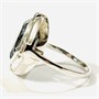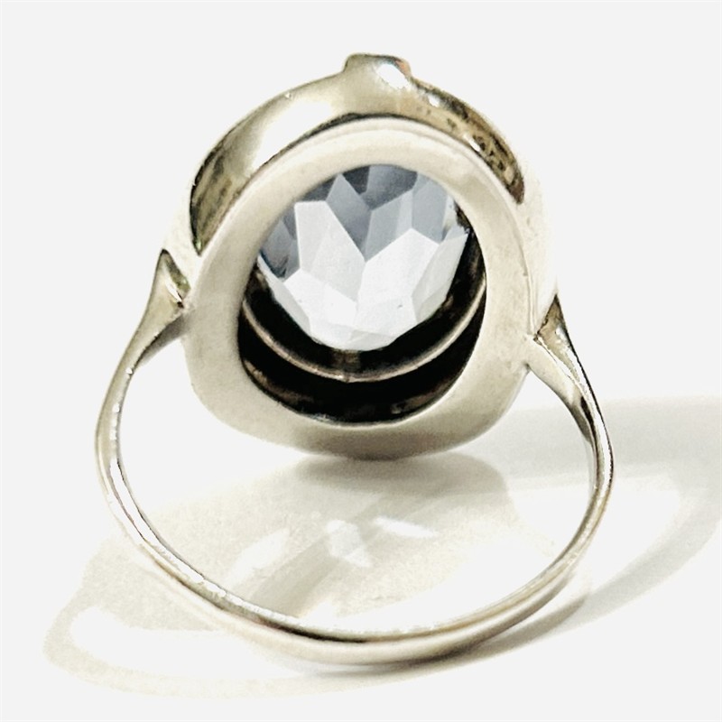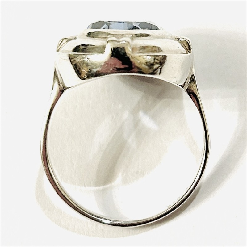 Elegantní, nadčasový prsten osazený topazově modrým kamenem oválného brusu, fasováno v plně přiléhající obrubě, minimalistická hlavice s plastickými pásky v osách. Německá zlatnická práce z 50. až 60. let 20. století. Zhotoveno z nezlaceného stříbra, hlavice o ryzosti 925/1000, šína o ryzosti 835/1000; nově označeno pucem S-68 (zajíc 4) a ryzostní číslo zevnitř šíny. Hmotnost 5,34 g, velikost 58, délka hlavice 20 mm. Kámen při hraně lehce podřený, při nošení není patrně, jinak v zachovalém stavu, odborně vyčištěno a vyleštěno zlatníkem.