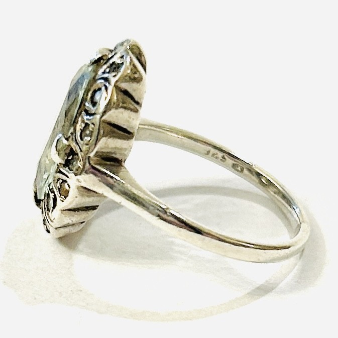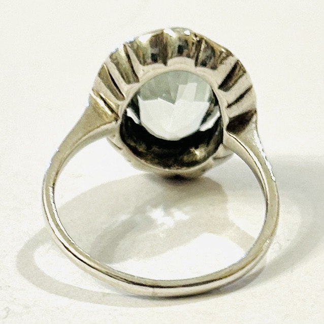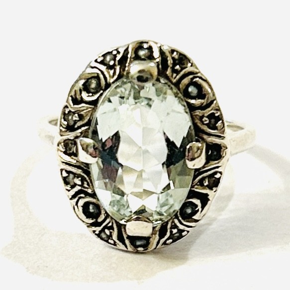 Elegantní prsten osazený přírodním světle modrým topazem oválného brusu, v ornamentálních lůžkách rámováno přírodními bílo-šedými perlami, ladná úzká šína. Kvalitní západoevropská zlatnická práce z 2. čtvrtiny 20. století. Zhotoveno z nezlaceného stříbra o ryzosti 925/1000; nově opatřeno puncem S-61 (kozlík 2) a ryzostní číslo zevnitř šíny. Hmotnost 5,12 g, velikost 56, délka hlavice 18 mm, šířka 15 mm. Velikost byla v minulosti upravována, celkově v dobrém stavu, odborně vyčištěno a vyleštěno zlatníkem.