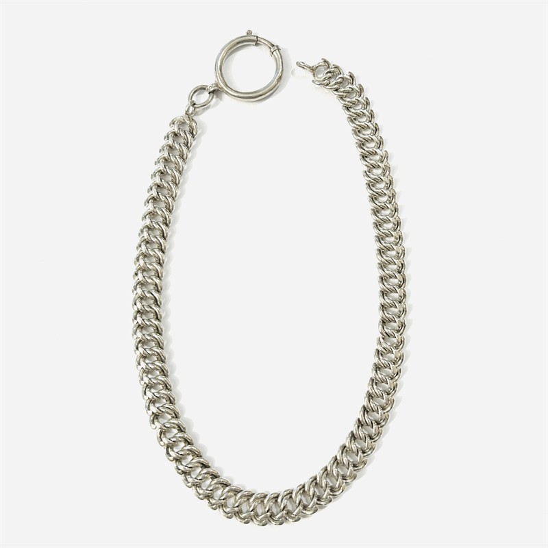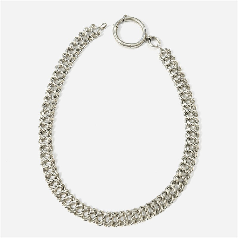 Starožitný masivnější řetízek k hodinkám/šatlén tradiční pletené ploché vazby. Kvalitní rakouská zlatnická práce z poslední čtvrtiny 19. až počátku 20. století. Zhotoveno z nezlaceného stříbra o ryzosti 750/1000; rakousko-uherský punc S-34 (lev 4), s atypickým spojením písmen „A“ i "B" u puncu (zároveň značí vídeňský a linecký puncovní úřad) a mistrovská značka na několika místech. Hmotnost 40,18 g, délka 35 cm, šířka vazby 9,5 mm. Zapínání formou pérového kroužku v pořádku, celkově v zachovalém stavu, odborně vyčištěno a vyleštěno zlatníkem.