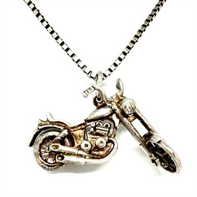 Stříbrný závěs -velmi detailně, realisticky propracovaná motorka. Sterlingové stříbro (925/1000), celková váha 5,47 g. Rozměry cca 3 x 2 cm. Kola i řidítka jsou otočná. Řetízek není součástí prodeje. Výborný stav.