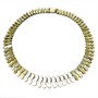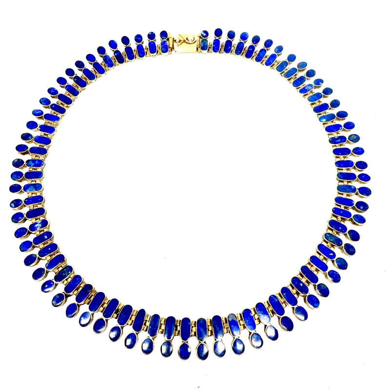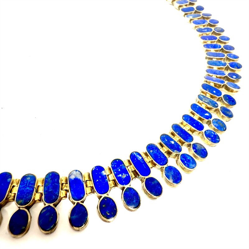 Výrazný, nepřehlédnutelný náhrdelník ze zlaceného stříbra. Šperk byl zhotoven v Mexiku z téměř ryzího stříbra (950/1000), o celkové váze 57,05 g. Náhrdelník se skládá z mnoha desítek vzájemně propojených článků. Ty jsou osazeny lápisy lazuli oválného tvaru, sytého modrého odstínu. Délka 45 cm. Pojistka zapínání. Nevšední, monumentální šperk ve výborném stavu.