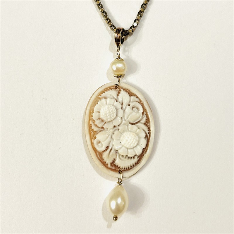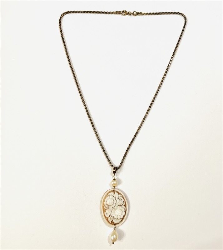 Výrazný, dekorativní náhrdelník tvořený přívěškem v pseudorenesančním stylu, tělo v podobě oválné kameje s florálními motivy, řezáno z přírodní bledě oranžovo-bílé mušloviny, doplněno o 2 přírodní kultivované perly nepravidelného kulatého a kapkového tvaru. Připojen odnímatelný řetízek atypické vazby blízké té "popcornové". Ruční italská (Arezzo) práce z přelomu 20. a 21. století. Zhotoveno z narůžověle zlaceného stříbra o ryzosti 925/1000, dráty u perliček ze zlata; nově opatřeno puncem S-61 (kozlík 2), ryzostní čísla a značka výrobce "1548 AR" na puncovní destičce, koncích u řetízku a očku u přívěšku. Hmotnost 10,71 g, délka řetízku 51 cm, šířka vazby 2 mm, délka závěsu 72 mm, šířka 26 mm. Karabinkové zapínání v pořádku, ponecháno s přirozenou patinou, lze vyčistit, celkově ve velmi zachovalém stavu.