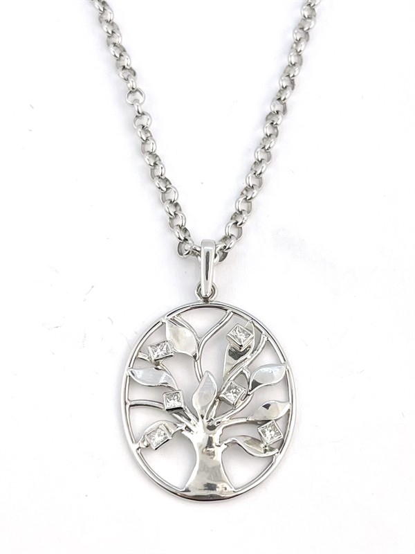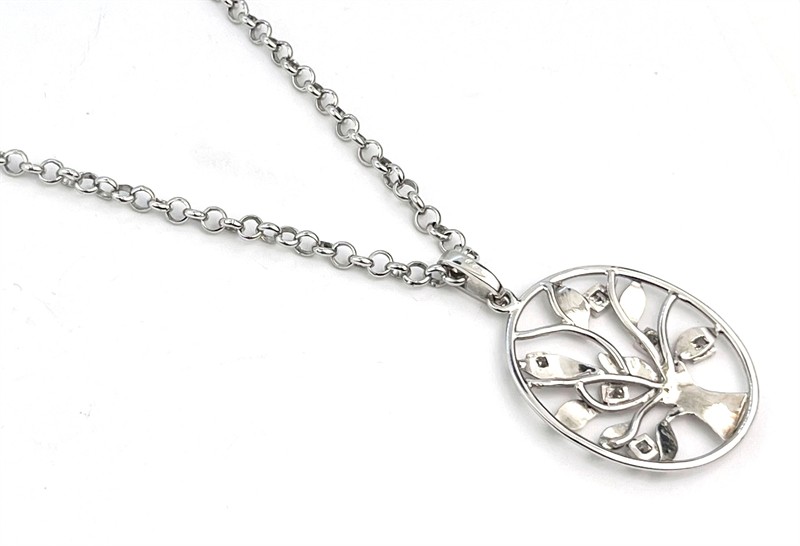 Velmi výrazný náhrdelník z bílého zlata ryzosti 585/1000 zdobí velký oválný závěs s oblíbeným námětem "strom života". V koruně stromu je zasazeno celkem šest přírodních diamantů brusu princess (roháček) celkové hmotnosti cca 0,60 ct. Závěs má rozměr 4 x 3,3 cm, silný řetízek má délku 44 cm s možností zkrácené varianty 42 cm. Díky mimořádné celkové hmotnosti 25,97 g náhrdelník představuje i zajímavou investiční příležitost.