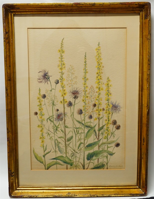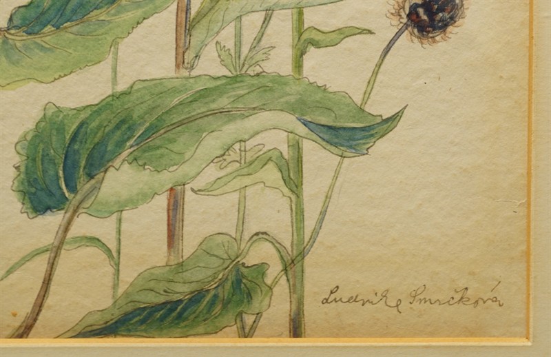 Práce většího formátu na papíře, kombinovaná technika od významné sklářské výtvarnice, malířky a pedagožky - Ludvika SMRČKOVÁ (*1903 Kladno +1991 Praha). Výtvarnice, která udávala směr moderního dekorativního a užitkového skla v polovině 20. století a její tvorba je zastoupena v mnoha domácích i zahraničních sbírkách. Signováno p.d. v původním rámu pod sklem. Drobné oťuky na rámu, jinak dobrý stav. Celkový rozměr 85 x 62cm, rozměr díla - 63 x 42cm