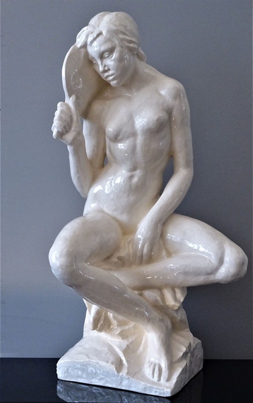 plastika Odpočívající tanečnice od Jana Štursy, glazované keramika, signováno na plintě ŠTURSA, výška 70 cm, na spodní části u nohy je vlasová trhlina asi 7 cm dlouhá a drobná vada na růžku plintu