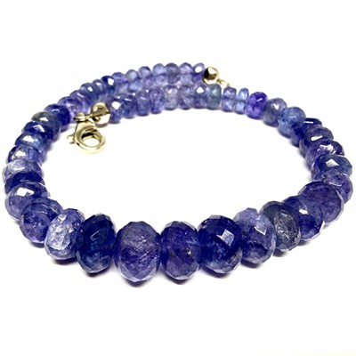 Půvabný náramek z přírodních tanzanitů modrofialového odstínu. Náramek je ukončen stříbrným zapínáním ze sterlingového stříbra. Drahé kameny se směrem ke středu zvětšují - jejich velikost je 3 - 7 mm. Délka 20 cm. Výborný stav.
