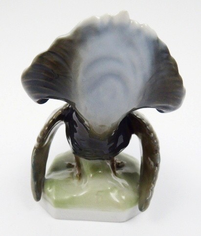 Bílý a ručně barevně malovaný porcelán. Autor modelu: Fritz Diller (1875-1946). Název modelu: Birkhahn (Tetřev). Návrh z roku 1913. Číslo modelu: 290. Porcelánka Rosenthal byla založena v roce 1879 Philippem Rosenthalem v německém Selbu. V roce 1929 slavila své 50. výročí. Porcelánová ručně barevně malovaná figura tetřeva v toku. Na nízkém osmibokém podstavci evokujícím zelený palouk. Značeno zespodu: zelená značka Rosenthal platná pro 20. léta minulého století a kulatá zlacená značka připomínající 50. výročí založení firmy s černým nápisem: 50 JAHRE, DIE WELTMARKE. Německo, kolem roku 1929. Výška 8,5 cm, šířka 10,5 cm.