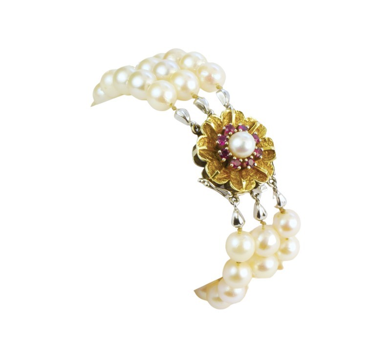 Náramek je tvořen třemi řadami pravých mořských perel (pravděpodobně typu Akoya), které mají vysoký lesk a bílou barvu. Dominantou šperku je masivní zlatá spona ve tvaru květiny. ze zlata ryzosti 585/1000 Střed spony je osazen centrální perlou, kterou obklopují drobné přírodní rubíny sytě červené barvy. Perly jsou navlečeny na hedvábné niti a fixovány uzlíky, což zabraňuje jejich vzájemnému odírání a zajišťuje bezpečnost při případném přetržení. Uzávěr je jištěn pojistkami. Délka náramku je 18 cm.