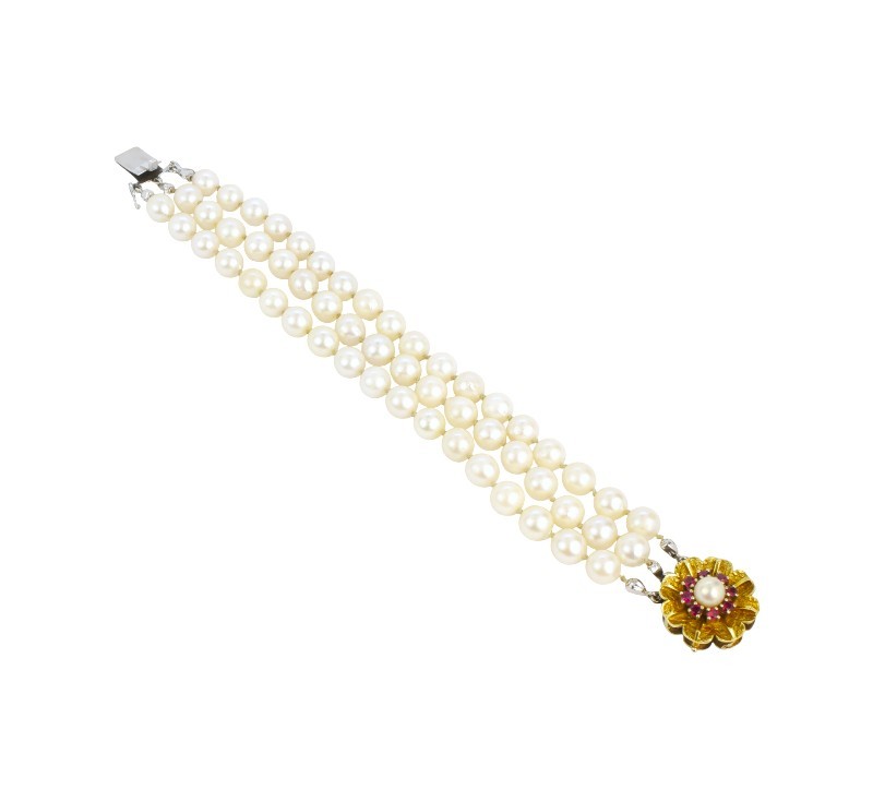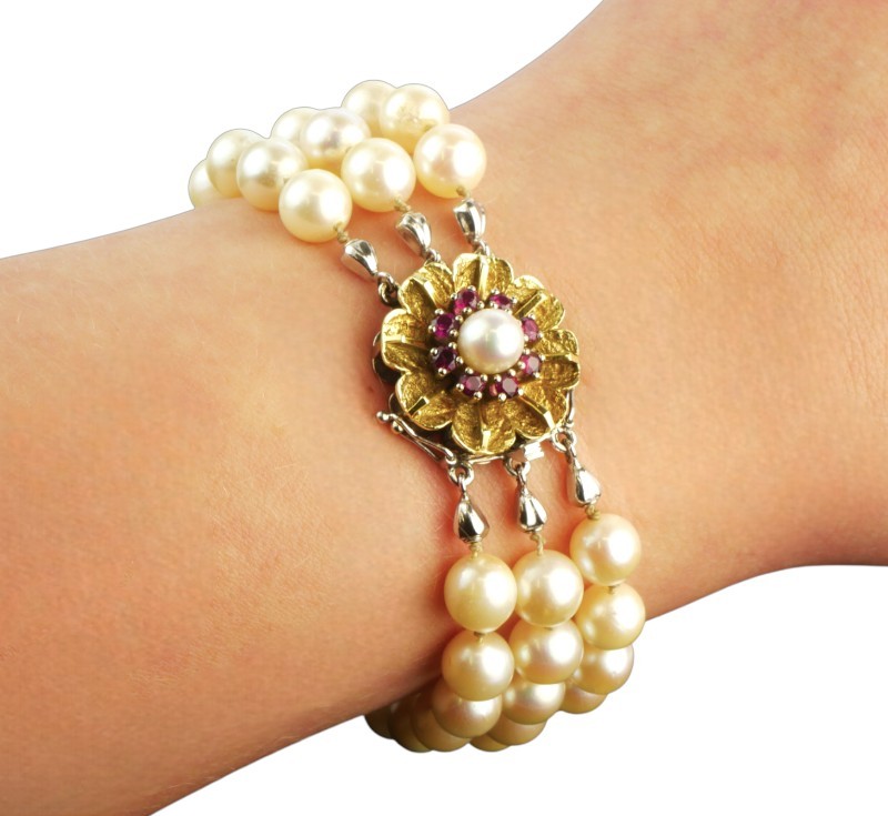 Třířadý perlový náramek se zlatým uzávěrem