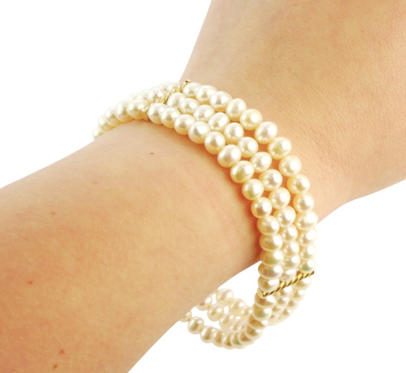 Třířadý perlový náramek s uzávěrem a spojovacími tyčkami ze zlata ryzosti 585/1000. Délka 21,5 cm.