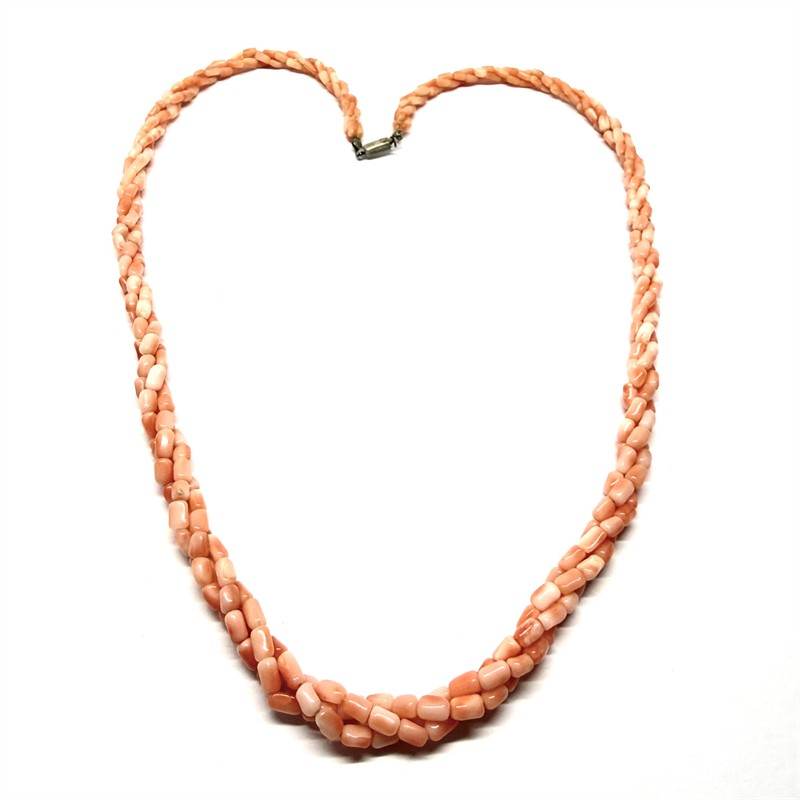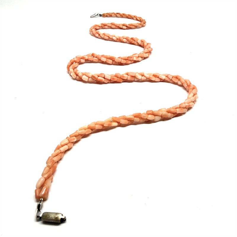 Elegantní náhrdelník spletený z tří řad andělských korálů, délka 61,5 cm, váha 28,52 g. Šperk je ukončen drobným, matovaným zapínáním ze stříbra ryzosti 835/1000. Výborný stav.
