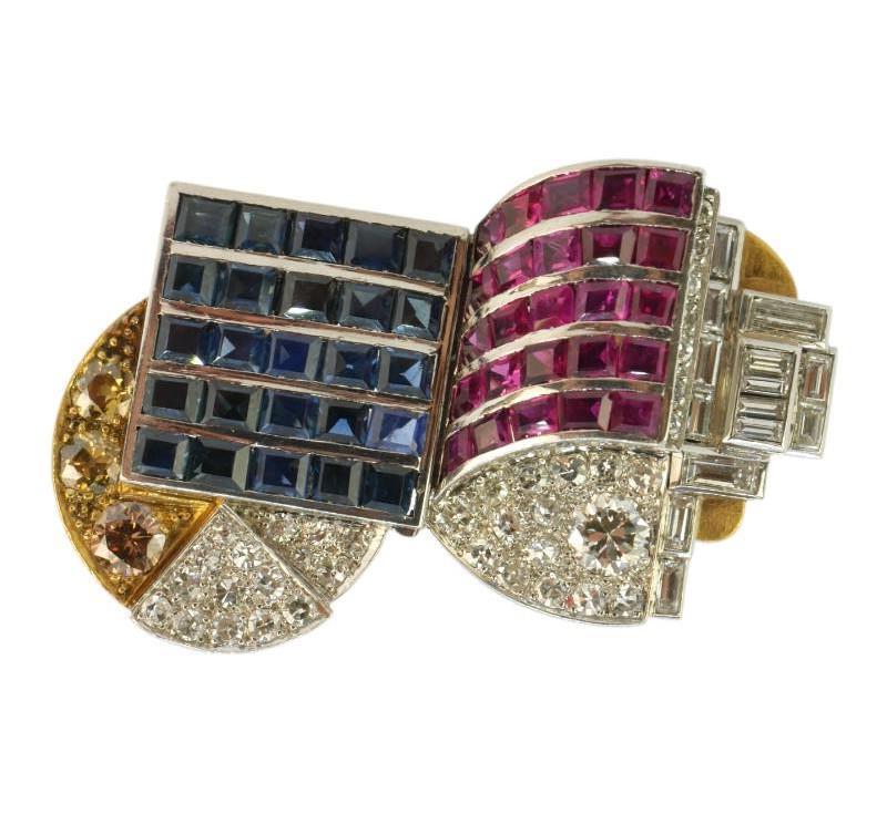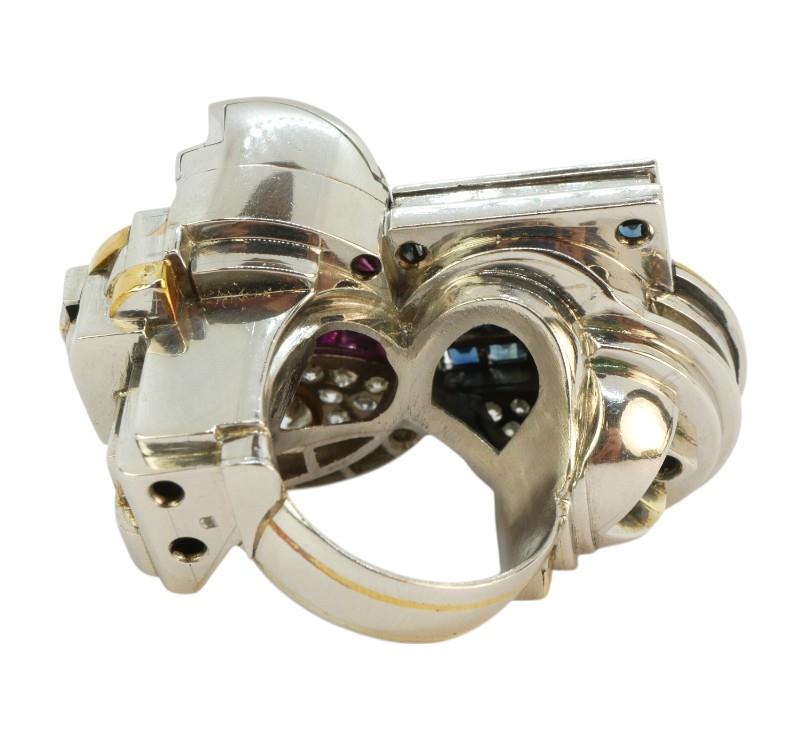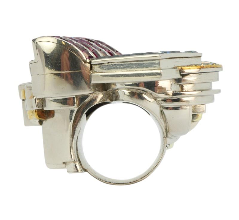 Naprosto výjimečný futuristický šperk je de facto drobným architektonickým dílem, zhotoveným na zakázku v roce 1936. Na jeho výrobu byla použita platina ryzosti 950/1000 a několik drobných detailů včetně dvou linek na šíně je ze žlutého zlata. Rozměrná hlava s motivem otevřené knihy, na jejíchž listech je mistrovsky zafasováno 25 přírodních rubínů celkové hmotnosti 2,60 ct a 25 safírů hmotnosti 3,87 ct. Prsten dále zdobí kvalitní přírodní brilianty dvou odstínů - čiré a Champagne, celkové hmotnosti 3,13 ct. Velikost prstenu cca 54 - 55 a celková hmotnost 47,43 g! Prodávající k prodeji doložil i originální stvrzenky z roku 1936.