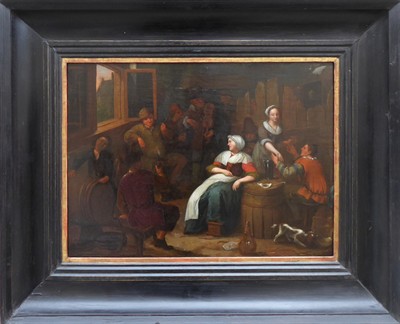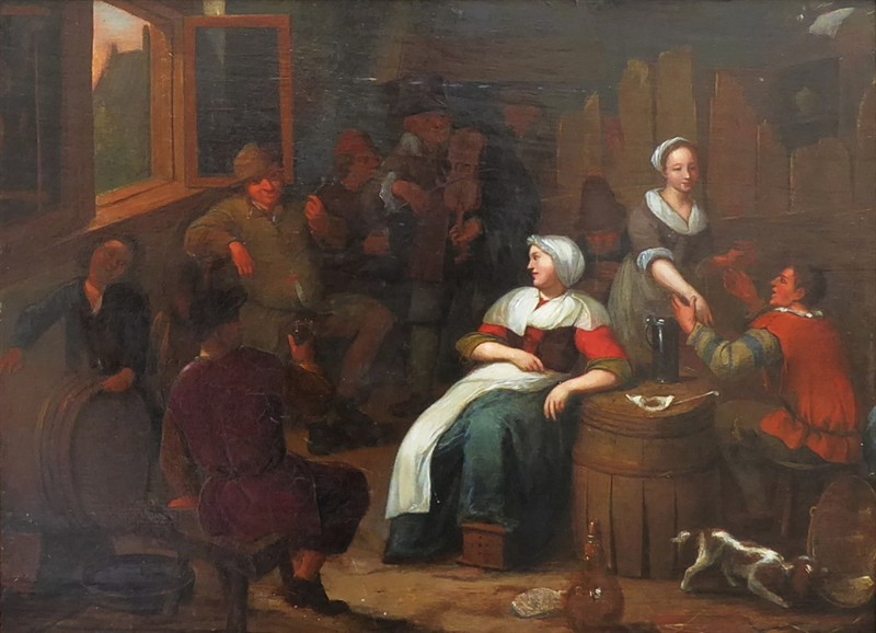 Olej na dřevěné desce 32 cm x 41,5 cm. Obraz namaloval německy mluvící malíř podle předlohy slavného holandského haarlemského malíře 17. století: Jan Miense Molenaer (1610-1668). Výjev z přeplněné krčmy s šenkýřkou v popředí. Na zadní straně štítek se jménem neméně významného dalšího holandského malíře 17. století Adriaena Brouwera (1605-1638). V černě mořeném profilovaném rámu ze zlacenou vnitřní lištou. Německy mluvící region, 18. století. Celkový rozměr s rámem 48 cm x 59 cm.