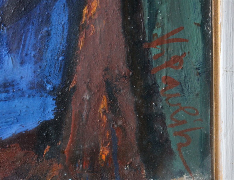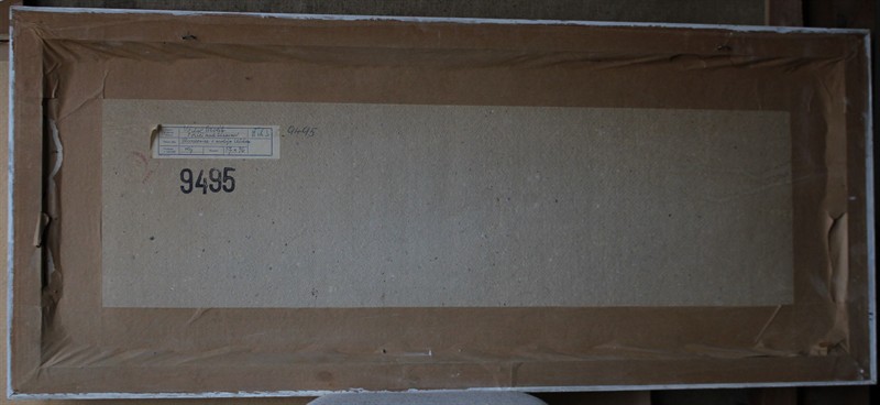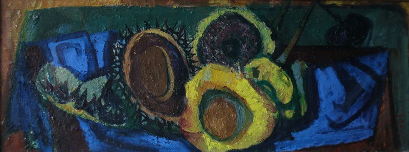 Václav Pavlík (19901 - 1966) Slunečnice s modrým klůchem Signováno viz foto. Scénograf, malíř a grafik. Olej na kartonu. Rozměry malba: 37 x 96 cm.