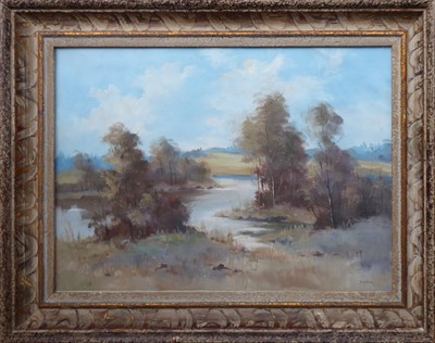 Olej na plátně fixovaném na kartonu 37 cm x 51 cm. Signováno vpravo dole. Autor obrazu: pravděpodobně Václav Sochor (1855-1935). Pohled na půvabné zákoutí se zátočinami horské říčky na louce s vysokými travami a bylinami. V originálním profilovaném rámu s patinou a sklem. Československo 1920 - 1935. Celkový rozměr 48 cm x 62 cm.