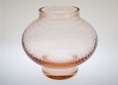 Větší váza z autorského hutního skla v neobvyklém barevném odstínu Rosalin se zataveným dekorem jemných bublinek "Kapky deště". Autorem návrhu masivní kulovité vázy kolem roku 1970 je sklářský výtvarník a malíř Milan METELÁK (*1928 +1993), provedení sklárny Borské sklo závod Harrachov. Dobrý stav, rozměr v. 18cm, prům. 20cm