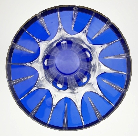 Bezbarvé a kobaltové sklo, ručně broušené. Ve stylu art deco. Vysoká elegantní váza ve stylu art deco ve tvaru přesýpacích hodin, kdy se válcovitě kuželovitý profil rozšiřuje směrem k hornímu okraji. Bezbarvé sklo přejímané sklem v barevnosti kobaltové modři. Ručně broušené svislé fazety vytvářející rytmický vzor s hroty, který připomíná okvětí leknínu či lotosu. Ve střední části pak ručně broušené pravidelné mírně reliéfní oválné ornamenty dekorované modrým kobaltovým sklem. Československo, minulé století. Výška 45,5 cm.