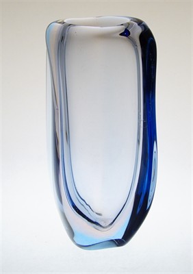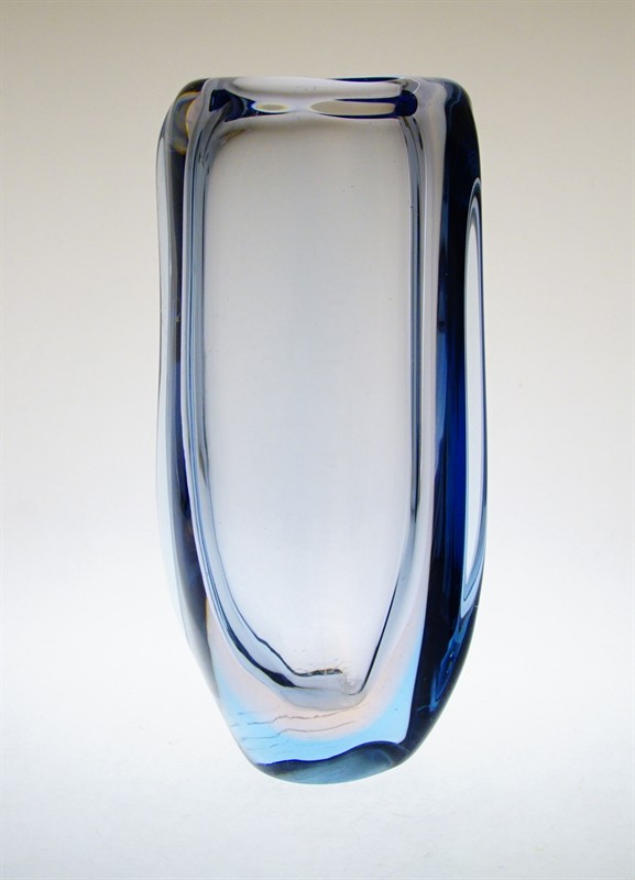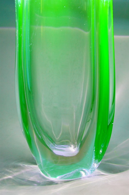 Váza z autorského hutního skla - kolekce ELEGANCE v odstínu Akvamarín s jádrem v odstínu Rosalín s příměsí uranového skla (uranové sklo při nasvícení UV světlem vytváří luminiscenční efekt viz posl. foto). Návrh z roku 1954 je od sklářského mistra a výtvarníka Jaroslava BERÁNKA (*1927 +2006), provedení sklárna Ústředí uměleckých řemesel Škrdlovice. Dobrý stav, rozměr v. 26 x 12 x 9cm