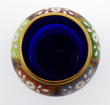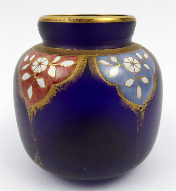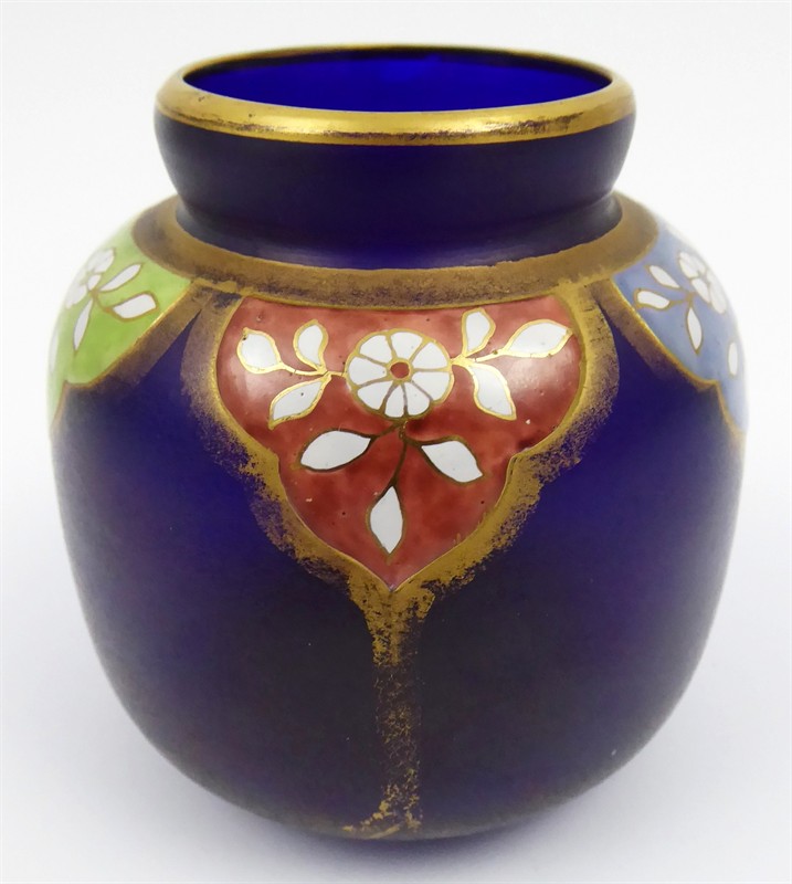 Kobaltové irizované sklo, ruční malba barevným emailem, ruční zlacení. Ve stylu proslulého Fritze Heckerta. Velmi zajímavá vázička z kobaltového irizovaného skla soudkovitého tvaru se zúženým hrdlem. Horní polovina vázičky je zdobená orientálním dekorativním ornamentem s florálními motivy (tzv. arabeska). Každé pole je ručně malované jinou emailovou barvou a ohraničené zlacením. Jednotlivé barevné segmenty zdobí drobná bílá kvítka s lístečky a zlatými úponky. Zlacené linky. Zlacení je zejména ve spodní části místy setřelé. Střední Evropa 1880 - 1900. Výška 7,5 cm.