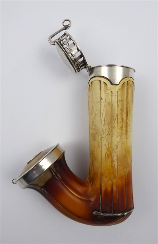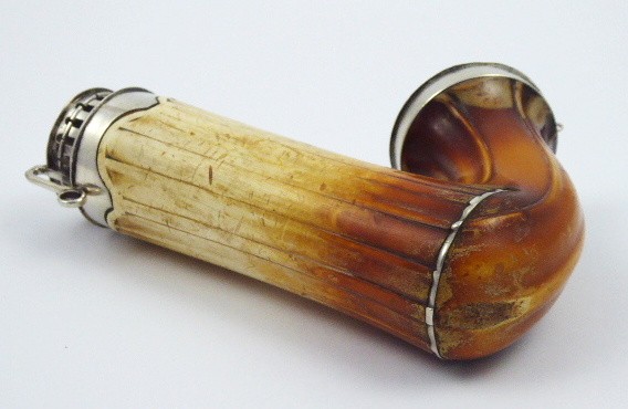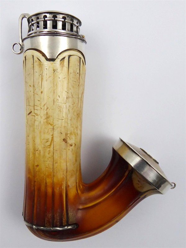 Stříbro, minerál sepiolit (mořská pěna). Ryzost Ag 812,5/1000, celková hmotnost 220,76 g. Velká dýmka s mírně reliéfním tělem z mořské pěny, což je minerál zvaný sepiolit vyskytující se v ložiscích např. v Řecku, Španělsku či v Maroku. Troubel s náustkem i hlavičkou na vložení kuřiva z pravého stříbra. Mořská pěna je zbarvena do slonovinové a hnědě skořicové barvy a je zdobena jemným rýhováním. Značeno: rakousko-uherský lotový punc. Rakousko-Uhersko 1824 - 1866. Délka 17 cm, průměr hlavičky 5,5 cm, průměr troubele s náustkem 3,5 cm.