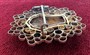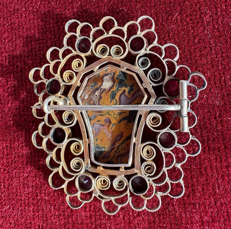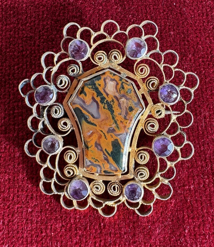 Velká stříbrná brož, částečně zlacená osazena centrálním průsvitným achátem a broušenými ametysty. Rozměry 5,1x5,1 cm, Celková váha brože 10,8 g