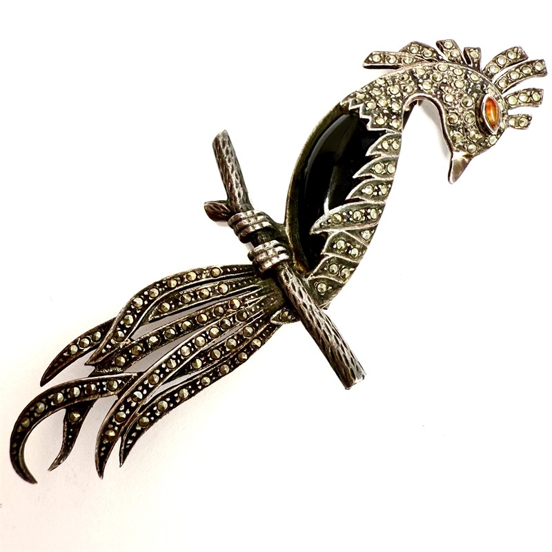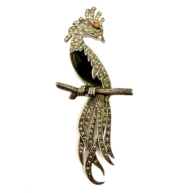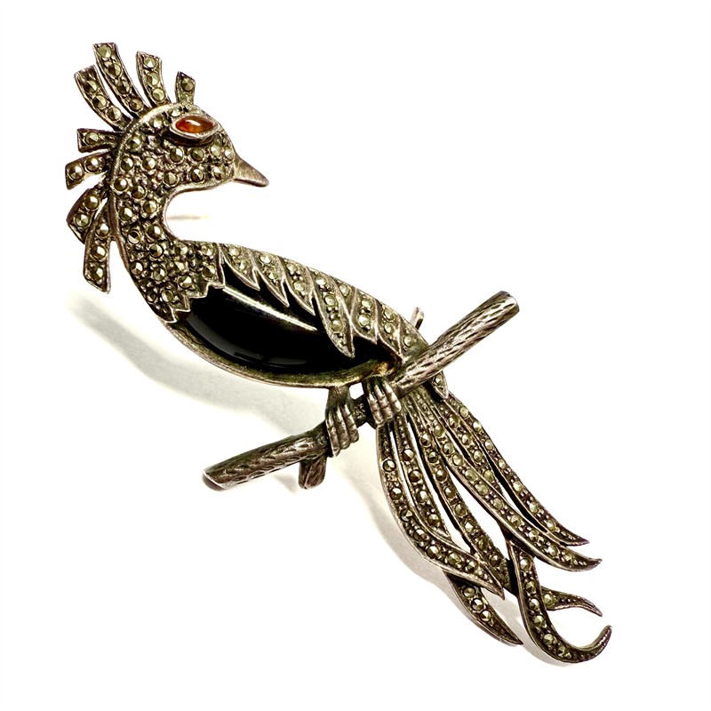 Výrazná, půvabná stříbrná brož zhotovená ve stylu Art deco - rajka sedící na větvi. Šperk zdobí černý onyx, drobnější karneol a velké množství drobných, elegantně se třpytících markazitů. Sterlingové stříbro (925/1000), celková váha 13,26 g. Délka cca 8 cm. Perfektní stav.