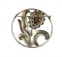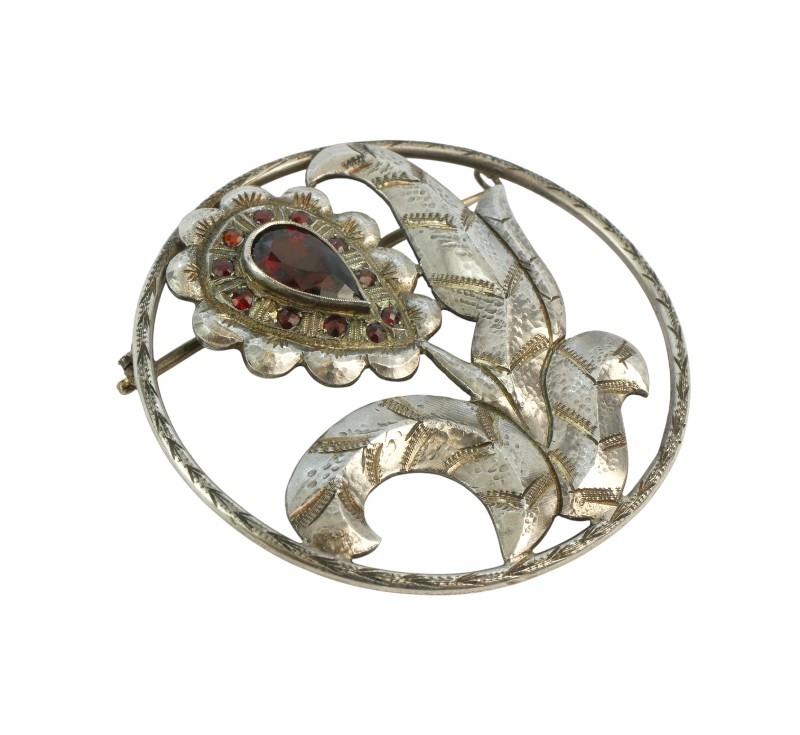 Originální tepaná brož se vsazeným velkým almandinem ve tvaru kapky a 11 granátky, art deco, 20. léta 20. století, stříbro 800/1000, mistrovská značka HP, průměr 5,6 cm, hmotnost 15,40 g, Turnov.