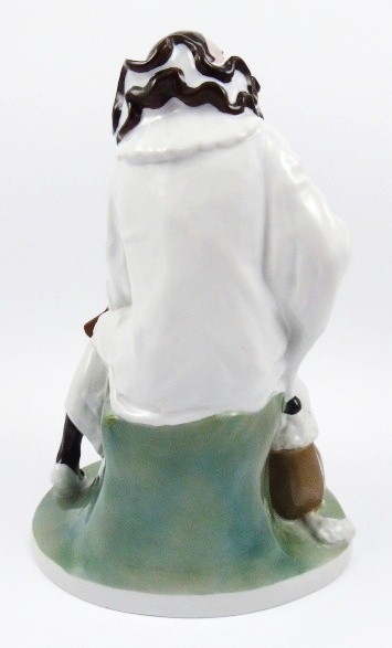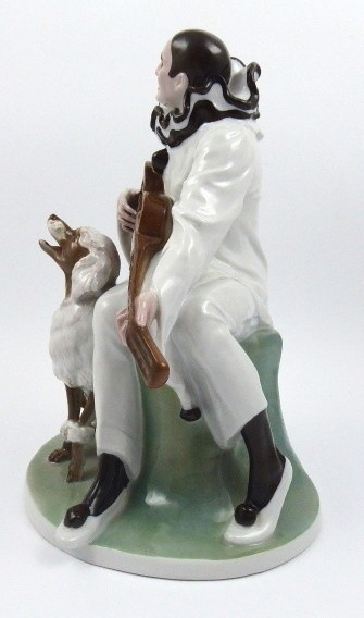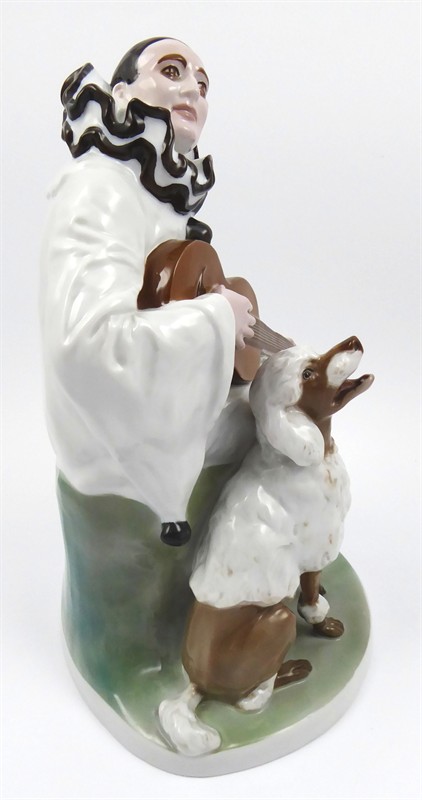 Bílý a barevně ručně malovaný glazovaný porcelán. Autor modelu: Rudolf Marcuse (1878-1940) pro Rosenthal. Datace designu: rok 1913. Název modelu: Duett (Gross) - velký. Číslo modelu: K 311. Publikováno v knize: Dieter Struss - Rosenthal, obrazová příloha na stránce 54. Rozměrné krásné porcelánové sousoší sedícího Pierota, tradiční postavy z italské komedie dell´arte, hrajícího na kytaru s velkým sedícím pudlem, který jej doprovází svým zpěvem. Na stylizovaném mírně oválném nízkém podstavci. Ve vynikajícím stavu. Značeno zespodu: značka Rosenthal pro dané období a vtlačené číslo modelu K 311. Německo, Rosenthal, kolem roku 1913. Výška 36 cm, podstavec 25 cm x 24 cm.