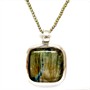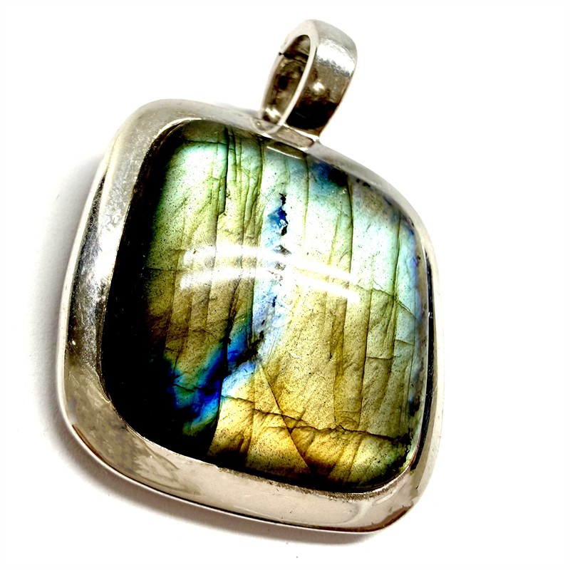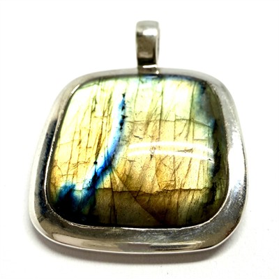 Výrazný, stříbrný závěs zhotovený v minimalistickém duchu. Šperku vévodí velký labradorit zelenozlatých odstínů s tmavým žíháním. Sterlingové stříbro (925/1000). Váha 20,18 g. Rozměry 3,5 x 3,5 cm bez závěsného očka. Závěsné očko je masivní a díky rozevření skýtá možnost nosit závěs nejen na řetízku, ale i na náhrdelníku z větších drahých kamenů. Profesionálně vyleštěno, výborný stav.