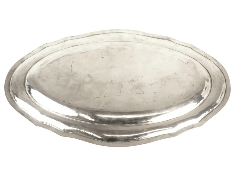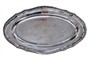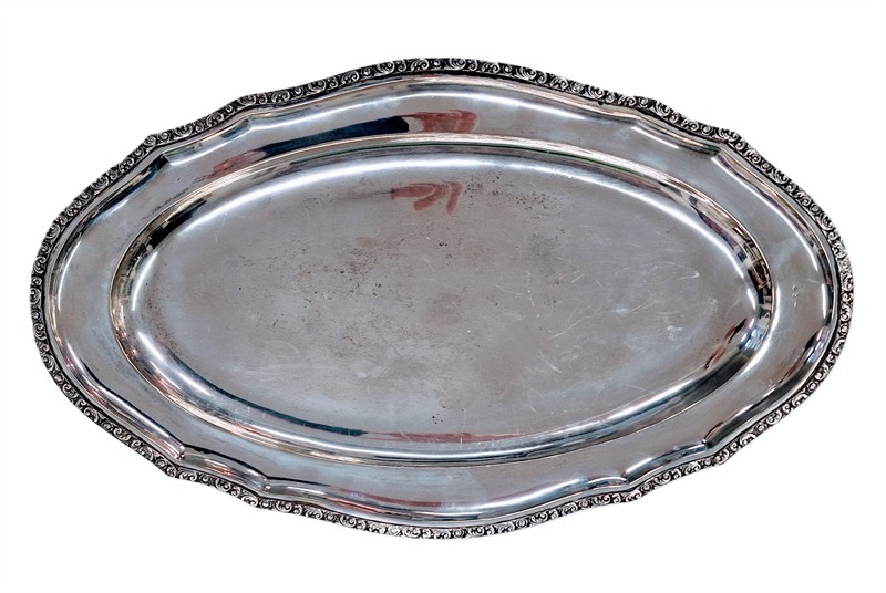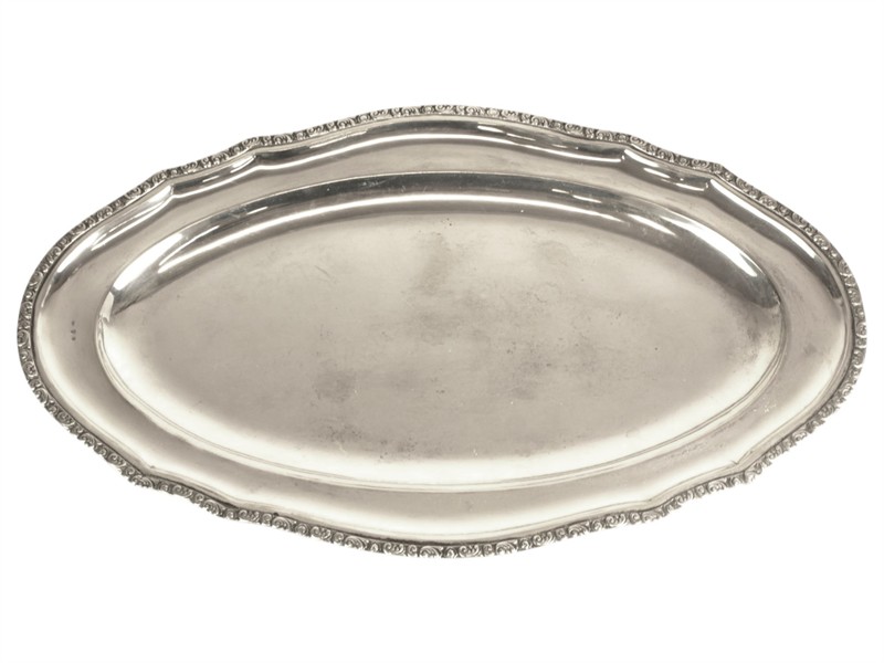 Oválný podnos vyrobený ze stříbra ryzosti 800/1000, po obvodu zdobený jemnou ornamentální bordurou s rostlinnými motivy. Rozměry podnosu 50,5 x 30,5 cm, hmotnost 1002 g.