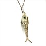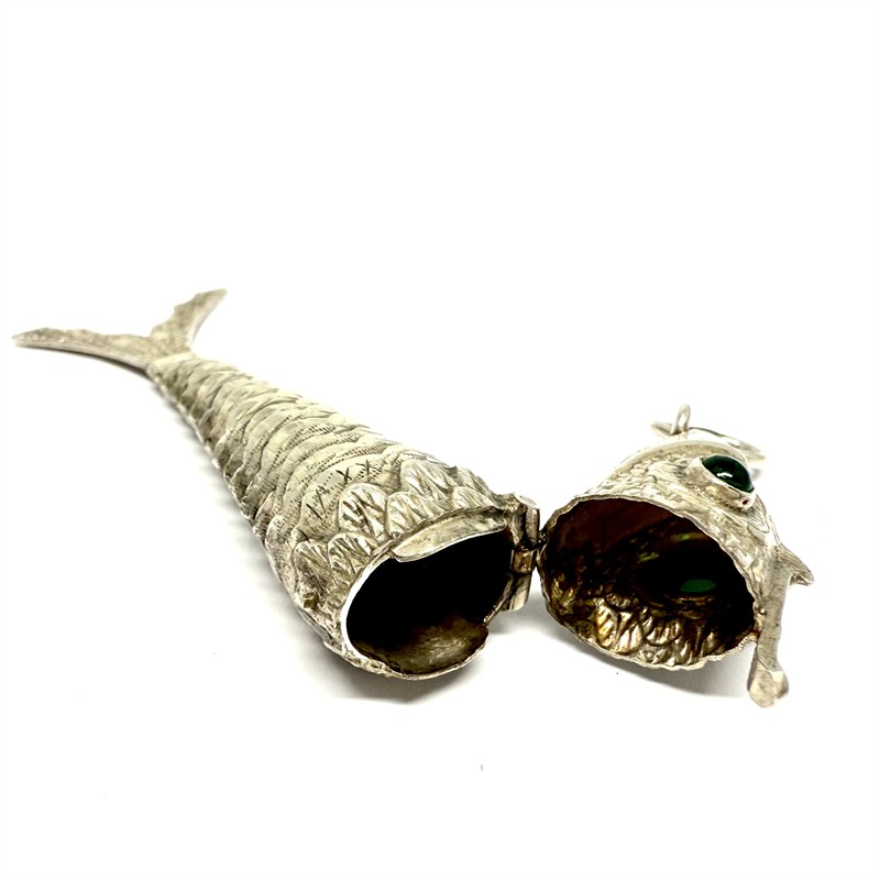 Nevšední, velmi detailně provedený závěs větších rozměrů. Šperk znázorňující rybu byl zhotoven v první polovině 20.století ze stříbra ryzosti 900/1000, o celkové váze 13,24 g. Oči zdobeny kabošony chryzoprasu, pohyblivé, článkovité tělo je perfektně ohebné. Rybu lze otevřít. Délka 8,3 cm. Perfektní stav.