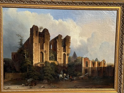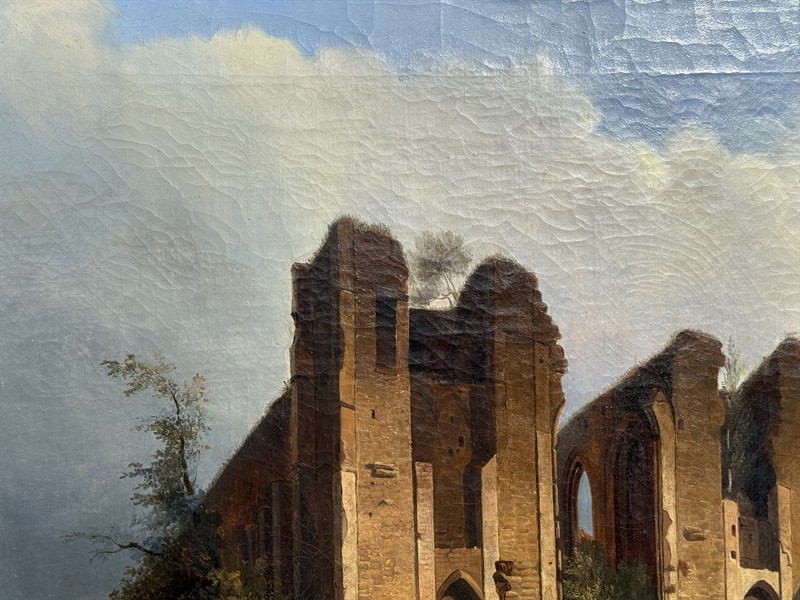 102 x 73 cm bez rámu, mistrovská muzeální kvalita, kolem roku 1800, cestující před rujinou, nesignováno, v dobrém původním stavu. Do historického i moderního interiéru! krásný kontrast světla a stínů.