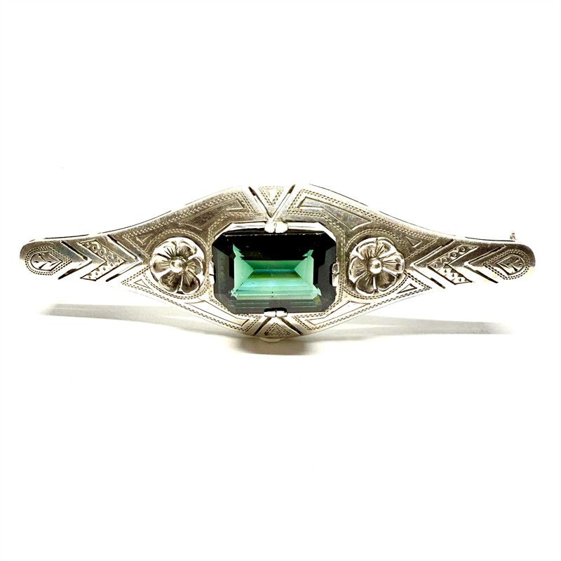 Elegantní, prvorepubliková stříbrná brož větších rozměrů. Šperk byl zhotoven ze stříbra ryzosti 835/1000 v první polovině 20.století. Brož je osazena fazetově broušeným spinelem tmavě zelené barvy. Rozměry 7 x 2 cm. Perfektní, sbírkový stav.