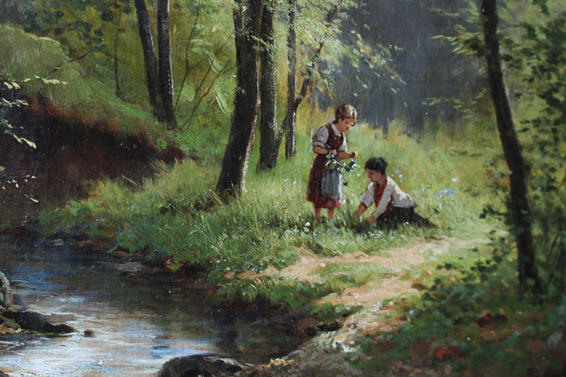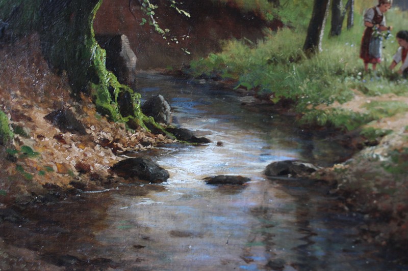 Victor Puhonny (1838 - 1909) Postavičky u řeky - 1888  Signováno viz foto. Olej na plátně, fixováno na kartonu. Rozměry malba: 42 x 69 cm.