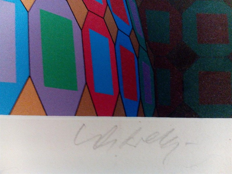 Serigrafie , ex. 109/250, signováno tužkou PD. Rozměry: celkem 97,5 x 56,5, tisková plocha 92x52 cm. Autor Victor Vasarely (1906 Pécs Maďarsko - 1997 Paříž), zakladatel uměleckého směru OP ART.