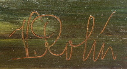 Olej na dřevěné desce 72 cm x 97 cm. Signováno vpravo dole. Autor obrazu: Viktor Rolín (1887-1942). Osamělý vzrostlý strom v poryvech větru stojící u vodní hladiny s rákosím pod zamračenou oblohou věštící příchod bouře. Originální galerijní rám francouzského typu s ornamenty ve stříbrné patině. Československo 1920 - 1935. Celkový rozměr s rámem 89 cm x 113 cm.