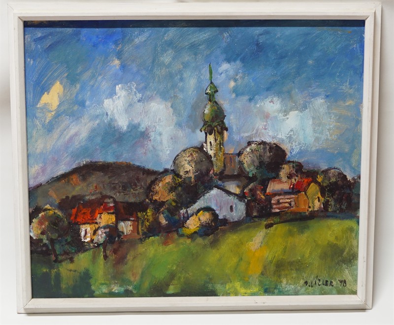 Letní krajinomalba s motivem venkovských stavení kolem kostelíčka pod modrobílou oblohou. Práce z roku 1978 od malíře, ilustrátora a pedagoga - Jiří LÍZLER (*1952 Jilemnice), působícího ve východních Čechách v okolí Jičína a Českého ráje. Olejomalba na desce v původním rámu, autorem sign. a dat. p.d. Dobý stav, celkový rozměr - 69 x 60cm, rozměr díla - 63 x 53cm