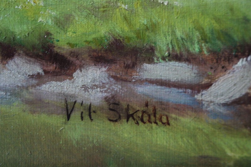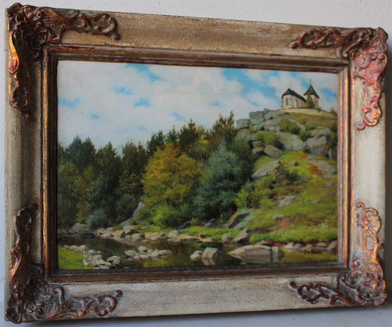Vít Skála (1883 - 1967) - Kostel na kopci Signováno viz foto. Byl český malíř, scénograf a režisér. Olej na kartonu. Rozměry malba: 34 x 50 cm.
