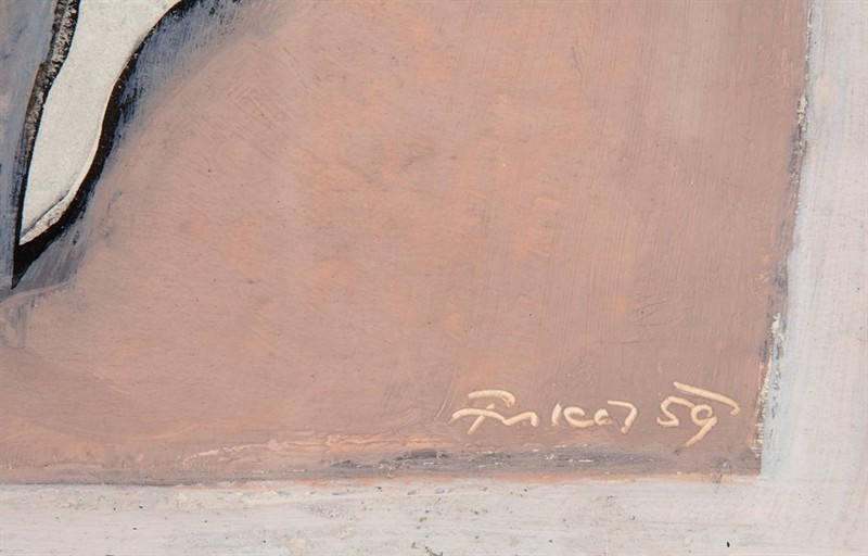 Kombinovaná technika na kartonu o velikosti 23,5 x 31 cm. Signováno a datováno vpravo dole “Fuka ‘59”, vkusně rámováno v paspartě pod sklem. Vladimír Fuka (1927–1977) byl významný český malíř, grafik, ilustrátor, autor objektů. Studoval na Státní škole grafické v Praze a na AVU v Praze u V. Rady a O. Nejedlého. V 60. letech emigroval do USA, v následujících období pracoval jako ilustrátor a grafik pro různá zahraniční nakladatelství, včetně ČR. Byl členem SVU Mánes. Jeho díla jsou součástí sbírek významných českých galerií a muzeí, včetně Ng.