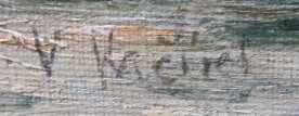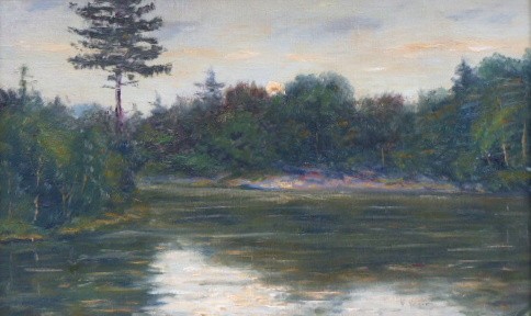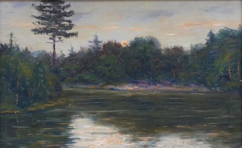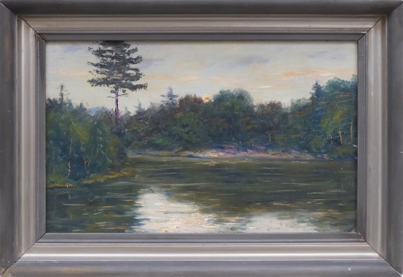 Olej na kartonu 27 cm x 43 cm. Signováno vpravo dole. Autor: Vlastimil Kačírek (1895-1970). Pohled za rozbřesku na zákoutí vodní plochy se zalesněnými břehy jimž korunuje ztepilá borovice. První sluneční paprsky prosvětlují hladinu. Stříbrný patinovaný rám. Československo 1920 - 1935. Celkový rozměr s rámem 35,5 cm x 51,5 cm.