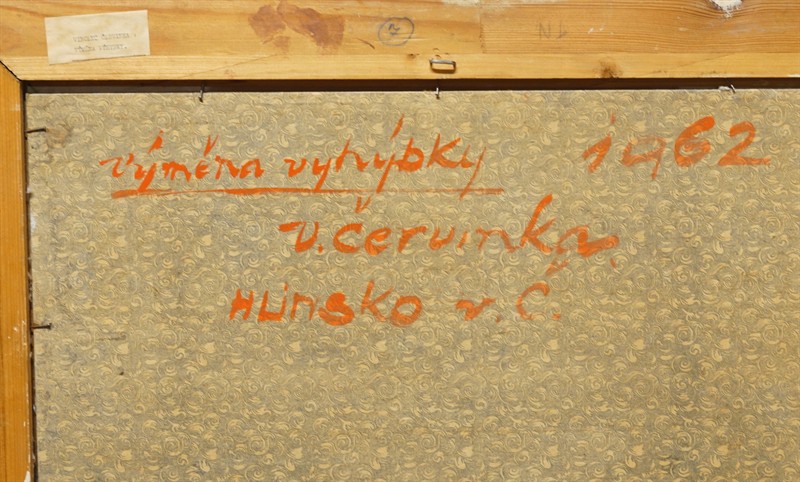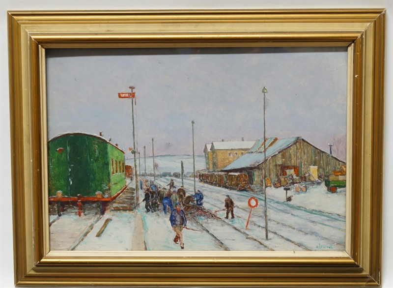 Neobvyklá malba zachycující pracovní četu drážních dělníků při opravě výhybky na zasněženém nádraží Hlinsko v Čechách. Podobných námětů se ve výtvarném umění mnoho nevyskytuje. Práce legionáře a malíře, žáka Fr. Kavána - Vincenc ČERVINKA (*1897), autor ve svých dílech zachycoval krajinu Hlinecka, Frýdlantska a Jeseníků. Olejomalba na desce z roku 1962 (na rubové straně je autorský štítek a název díla), sig. p.d. v původním rámu pod sklem. Dobrý stav, rozměr rámu - 60 x 46cm, rozměr díla - 48 x 33cm